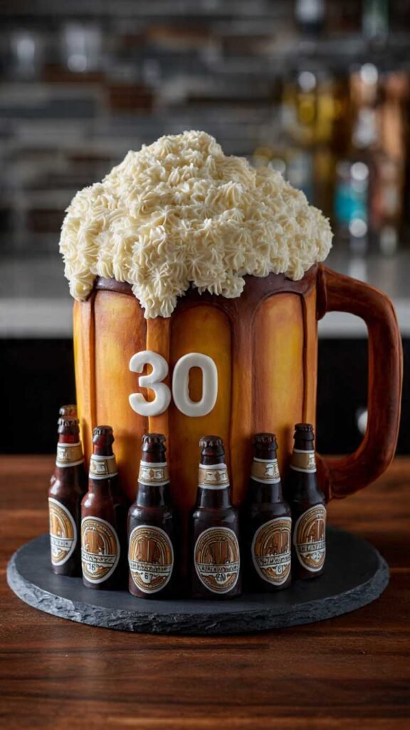 For the craft beer lover or the guy who just really enjoys a good beer with friends, shape a cake like a giant beer mug. Carve it into the mug shape, cover it in light brown or amber buttercream to look like beer, and top it with white buttercream piped and textured to look like foam head. You could add his favorite beer brand’s logo, his name, and “30” on the mug. Maybe include fondant beer bottle decorations around the base. Make it beer-flavored cake or a rich chocolate stout cake for extra authenticity. It’s fun, it’s masculine, and perfect for casual birthday parties, barbecues, or brewery celebrations.