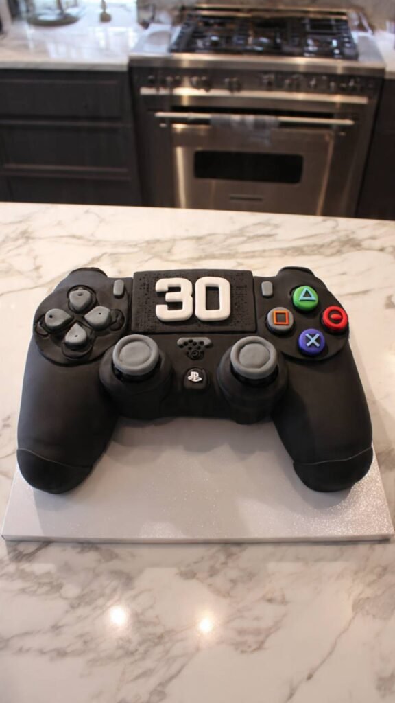 For the gamer who still loves video games at thirty, create a cake shaped like his favorite gaming controller. Whether it’s PlayStation, Xbox, Nintendo, or retro gaming, sculpt the cake into the controller shape and decorate it with all the accurate details – buttons in the right colors, joysticks, logos, everything. Use fondant for the details to get them precise. Add “30” somewhere on the controller or on the base. You could even include game-related decorations around it like coins, power-ups, or characters if he has a favorite game. It’s perfect for guys who never outgrew gaming and aren’t embarrassed to show they still love it.