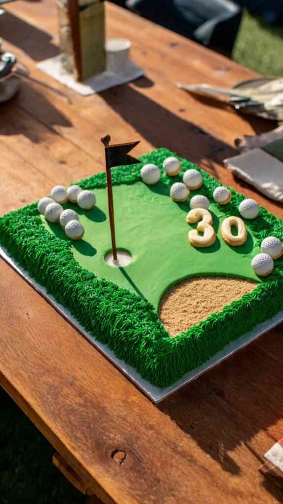For the golf enthusiast who spends every weekend on the course, create a cake designed like a golf green. Make it rectangular like a section of course, cover it in green buttercream textured to look like grass, add a fondant flag in the hole with “30” on it. Include fondant golf balls, tees, maybe a golf club leaning against the side. You could add sand traps made with crushed graham crackers, water hazards in blue, whatever elements make it look like an actual golf course. Write “Happy 30th” in the rough or on a scorecard decoration. It’s perfect for golf lovers and works great for casual outdoor celebrations or clubhouse parties.