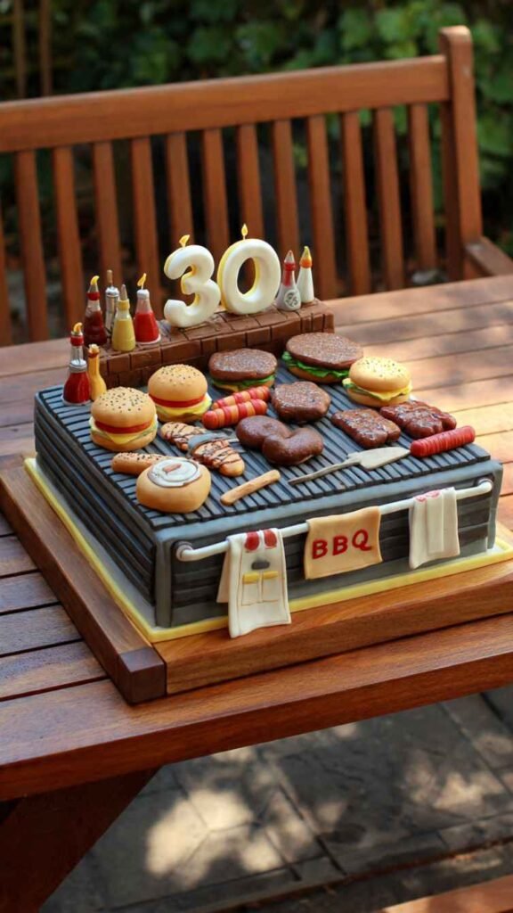 For the guy who takes his grilling seriously and is the designated grill master at every gathering, create a cake that celebrates his BBQ skills. Shape it like a grill with fondant burgers, steaks, and hot dogs on top, include BBQ tools like spatulas and tongs, add flames or smoke details. You could do it as a rectangular grill from the side view or top view showing the grates. Add “30” on a fondant apron or as a brand mark. Include BBQ sauce bottles, spice rubs, whatever represents his grilling passion. It’s fun and perfect for backyard birthday parties, summer celebrations, or guys who basically live at their grill all summer.