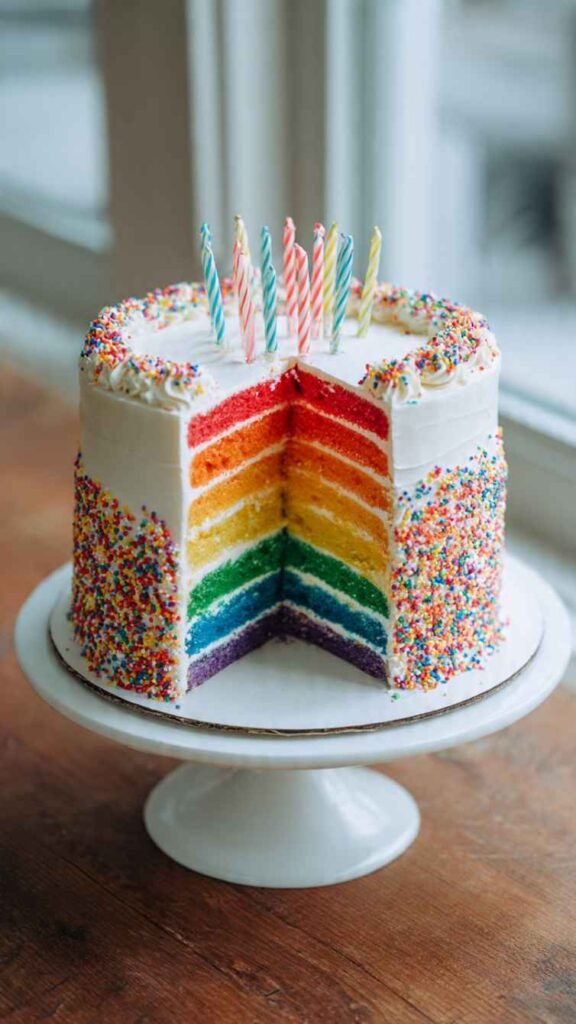 This is the rainbow cake that started it all – simple white buttercream on the outside, but when you slice it, boom, six beautiful rainbow layers inside. Each layer is a different color of the rainbow – red, orange, yellow, green, blue, and purple – and they should be vibrant and bright. The white frosting keeps it looking clean and classic on the outside, then the rainbow is this amazing surprise when you cut into it. You can add some rainbow sprinkles cascading down one side, or keep it totally simple. Top it with a few candles or a simple “Happy Birthday” topper. It never goes out of style and works for absolutely any age.