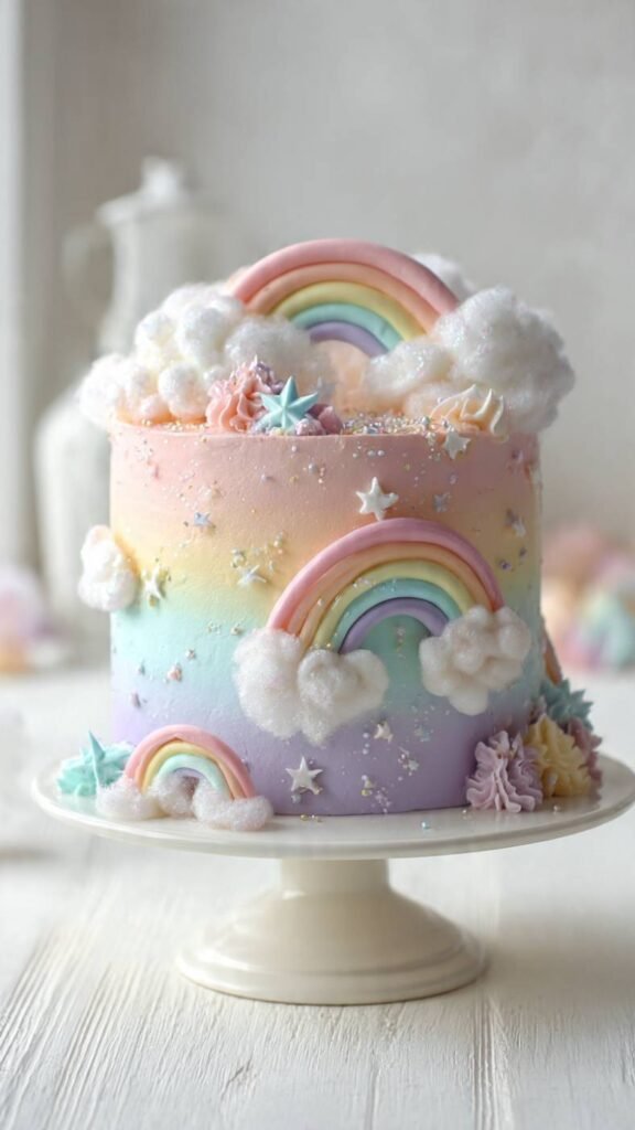 For a softer, dreamier version of the rainbow cake, use pastel rainbow colors instead of bright primaries. Think pale pink, peach, soft yellow, mint green, baby blue, and lavender – all those gentle, sweet colors. You can do pastel rainbow layers inside, and decorate the outside with white buttercream clouds and pastel rainbow arches piped in buttercream or made from fondant. Add some star sprinkles in pastel colors, maybe some cotton candy on top for extra cloud effect. It’s whimsical and sweet without being too loud or overwhelming. Perfect for baby showers, young children, or anyone who loves soft pretty colors and dreamy aesthetics.