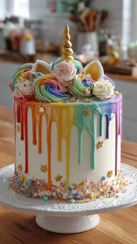 3. Rainbow Drip Cake with Unicorn Theme
