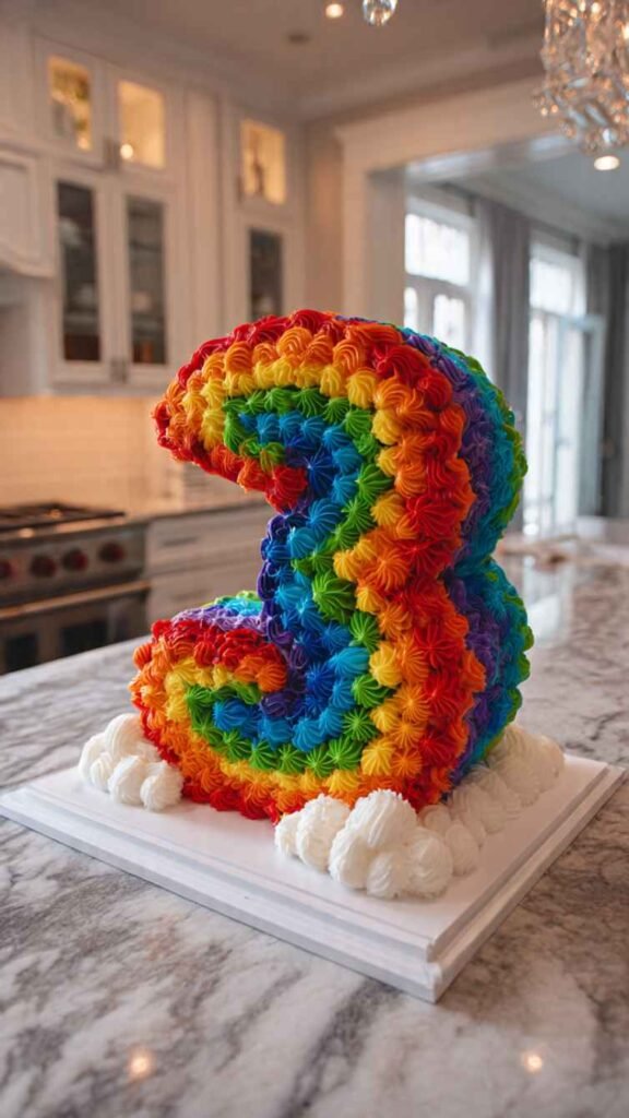Instead of traditional round tiers, create the birthday person’s age out of shaped cake covered in rainbow elements. If they’re turning five, make a big number 5 cake and cover it completely in rainbow buttercream rosettes, or rainbow sprinkles, or create rainbow stripes across it. You could also do rainbow layers inside the number when you cut it. Set it on a cake board decorated with clouds, stars, or rainbows. The shaped number makes it super personal and the rainbow makes it celebratory and fun. It’s become really popular because it photographs so well and is easy to serve since you just slice the number like a sheet cake.