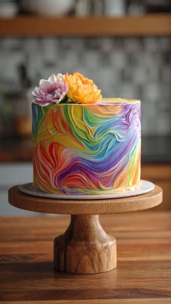 This technique creates the most gorgeous swirled rainbow effect on the outside of the cake. You load different colored buttercreams into a piping bag at the same time, then pipe them together so they create natural rainbow swirls as you frost the cake. The colors blend and swirl together in this organic, beautiful way. You can do it with bright rainbow colors or pastels. The effect is almost tie-dye looking, very artistic and unique. Top it simply with some sprinkles or fresh flowers. Inside you can have rainbow layers or keep it simple. It’s stunning and actually easier than it looks once you know the technique.