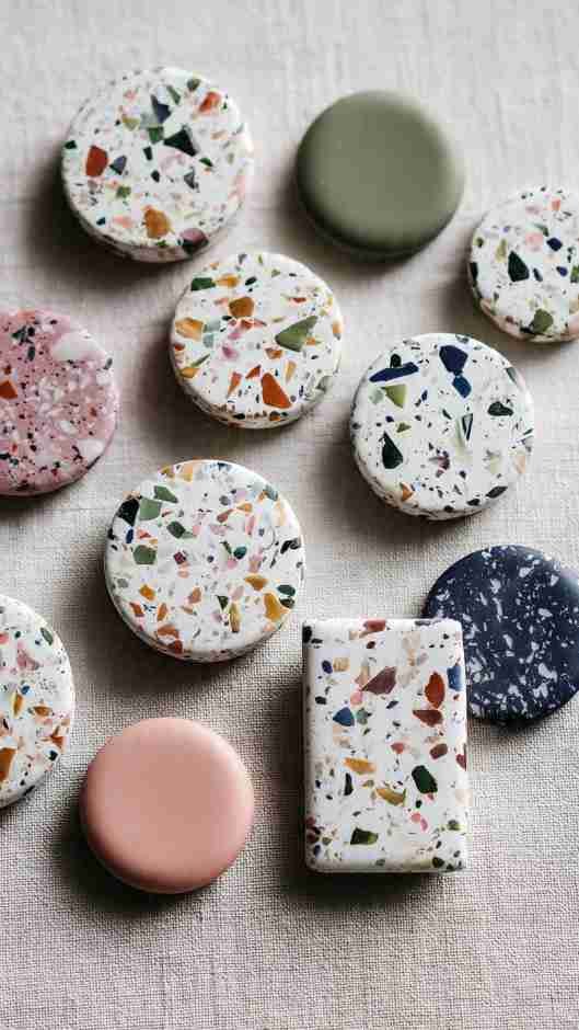 What It Is: Flat clay magnets with a terrazzo pattern made by embedding tiny colorful clay pieces into a white or neutral clay base before baking.