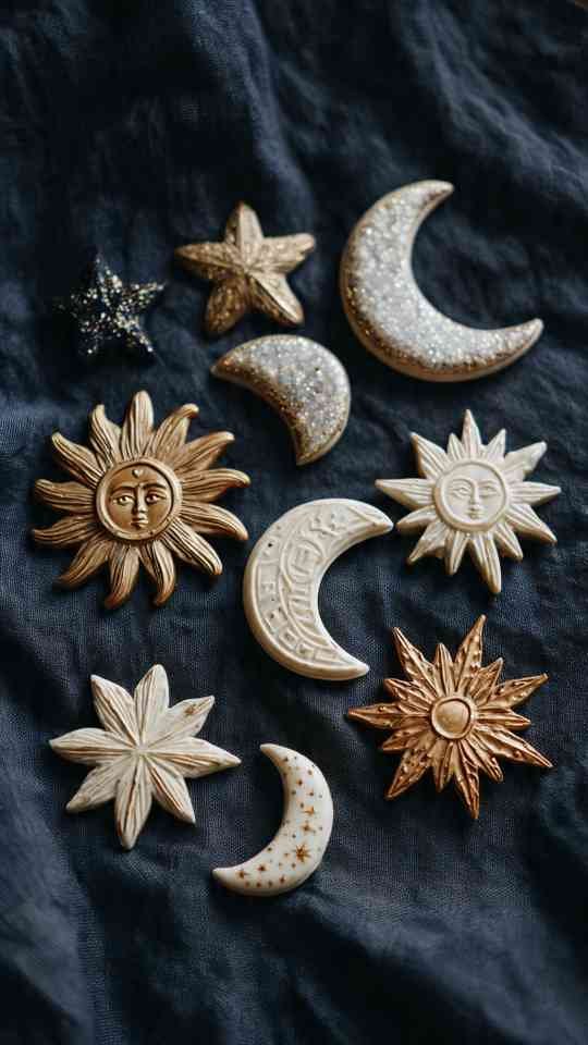 What It Is: A coordinated set of clay magnets in celestial shapes – crescent moons, stars, suns, and planets – finished in metallic or matte tones.