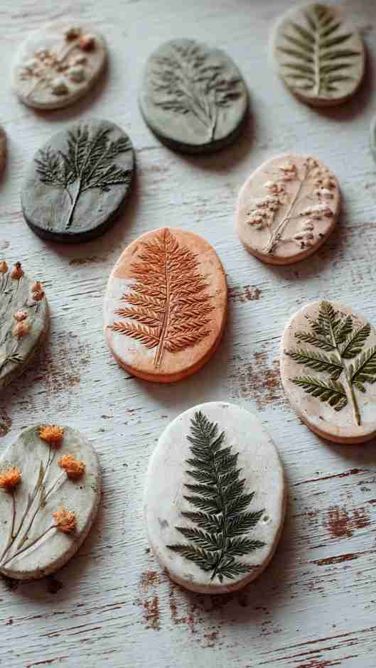 This idea combines two crafts in one because you’re pressing real flowers or leaves into the clay surface before baking to leave a beautiful imprint. You collect small flowers, fern fronds, herb leaves – whatever you can find in your garden or even from produce at the grocery store – press them firmly into rolled clay, then peel them away. What’s left is this incredibly delicate, detailed botanical print baked right into the surface. Finish them in earthy tones or leave them natural clay color. They look handcrafted in the best, most thoughtful way.