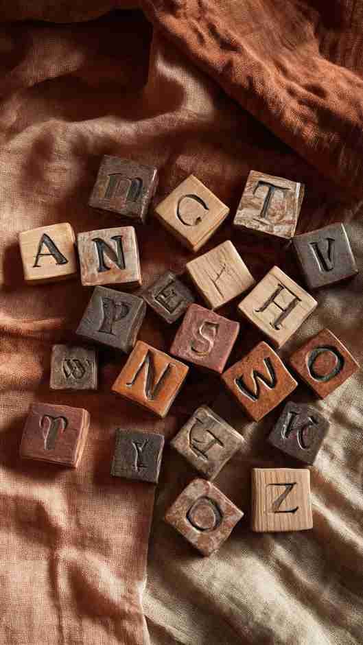 What It Is: Small square or rectangular clay tiles with letters, initials, or short words pressed or stamped into the surface, used as individual letter fridge magnets.
