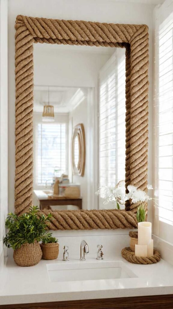 Supplies and Budget: Natural jute or manila rope ($8–12), hot glue gun and glue sticks ($5–8 if you don’t own one), scissors, existing mirror with frame. Total: $13–$20