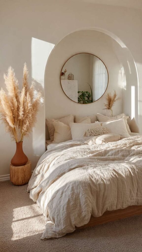 This last idea is technically as much about the wall as the mirror itself, and that’s what makes it so genius. You hang a simple frameless or plain framed mirror and then paint a large arch or scallop shape directly on the wall behind and around it using the same paint technique. The painted arch becomes the mirror’s frame and the result looks like a custom built-in architectural detail. This is huge in interior design right now and it photographs beautifully which means it works incredibly well as a content backdrop too. The whole project costs almost nothing if you already have paint.