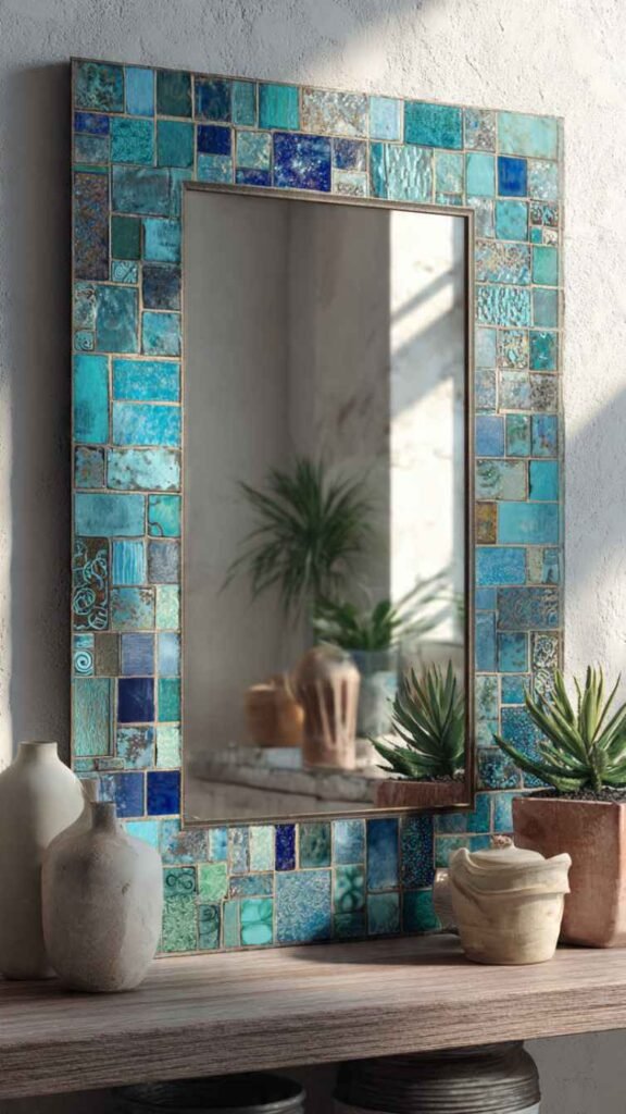 What It Is: A decorative mirror frame covered in mosaic pieces – broken tiles, glass tiles, mirror shards, or sea glass – set in tile adhesive and grouted for a colorful, artistic finish.