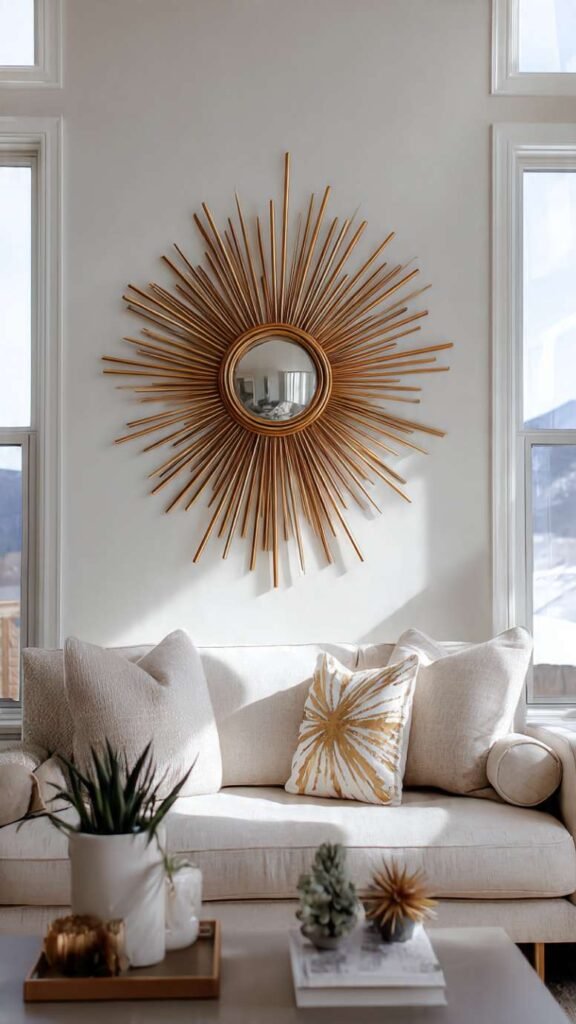 The sunburst mirror is having an ongoing moment in home decor and making your own is so much more satisfying than buying one because you control the size, the finish, and the length of the rays. The classic version uses wooden dowels or even bamboo skewers glued in a radiating pattern around the mirror’s edge, then painted gold, brass, or natural wood tone. The result is dramatic and graphic and works in living rooms, entryways, and bedrooms equally well. The scale is completely up to you and a larger sunburst makes a genuinely bold statement wall piece.