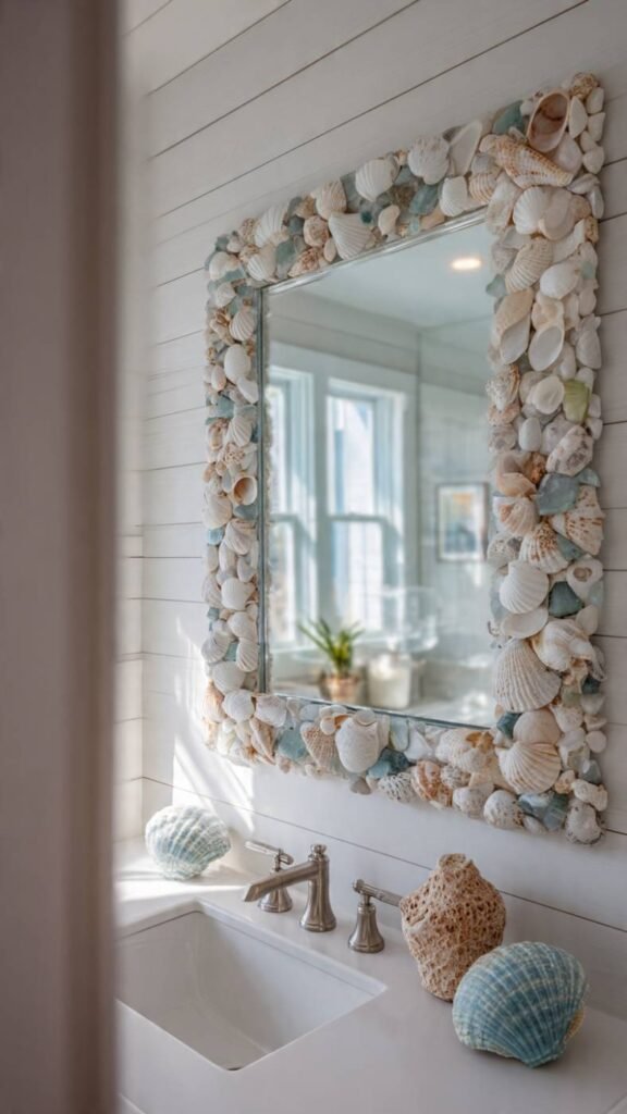 Supplies and Budget: Collected shells and sea glass (free from beach trips or $8–15 craft store), strong craft adhesive or E6000 glue ($5–7), optional grout for gaps ($5), existing mirror. Total: $10–$27