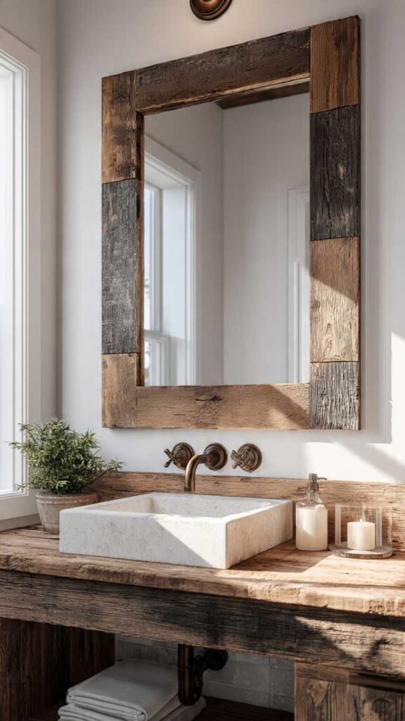 What It Is: A mirror frame built from reclaimed wood planks or pallet wood pieces, cut and assembled around the mirror for a warm, rustic handmade look with natural character.