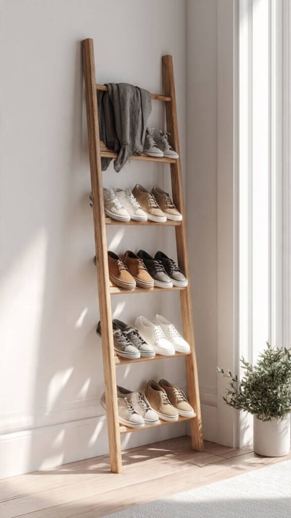 A leaning ladder used as a shoe rack is one of those ideas that is so obvious once you see it that you wonder why you didn’t think of it sooner. You either buy a simple wooden ladder from a craft or hardware store or build one from basic lumber, lean it against the wall, and drape shoes over the rungs. The angled lean keeps it stable without any wall mounting, the open design means it looks airy rather than bulky, and the wooden ladder aesthetic works in farmhouse, Scandinavian, modern, and rustic interiors equally well. It’s functional and genuinely attractive.