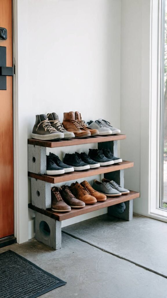 What It Is: A freestanding multi-tier shoe shelf built by stacking cinder blocks as supports at each end with wooden planks laid across them as shoe shelves, requiring no tools or construction.