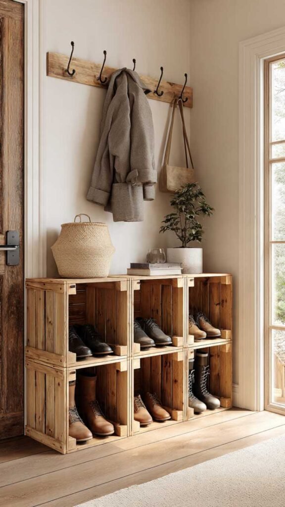 4. Wooden Crate Stacked Shoe Storage