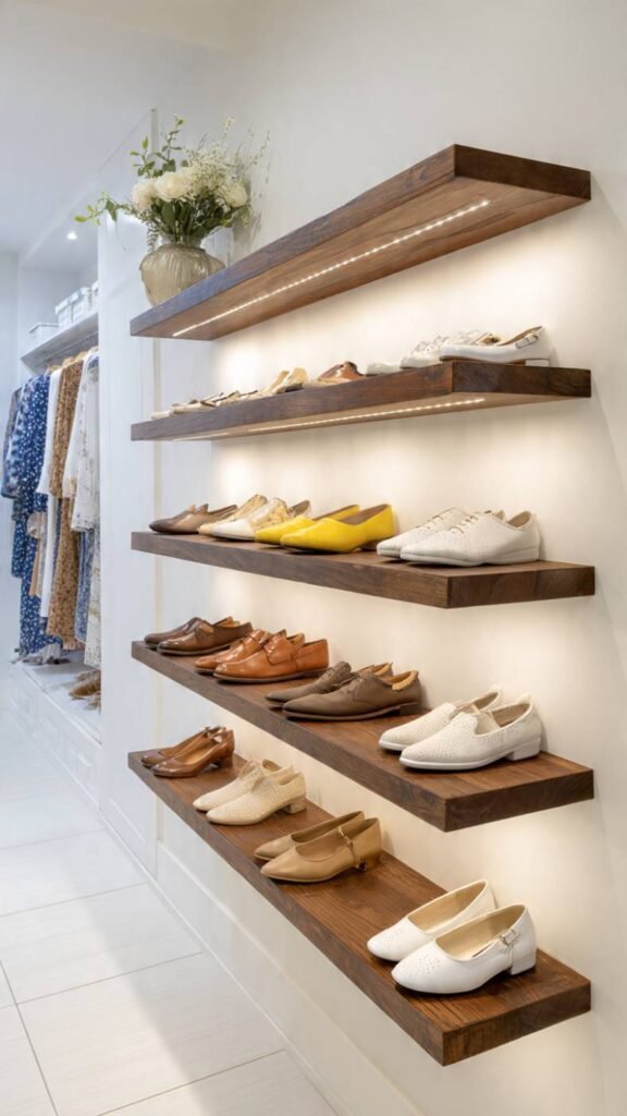 What It Is: Individual wall-mounted floating shelves installed at staggered heights specifically sized and spaced for shoe storage, keeping all shoes off the floor and displayed like a shoe store wall.