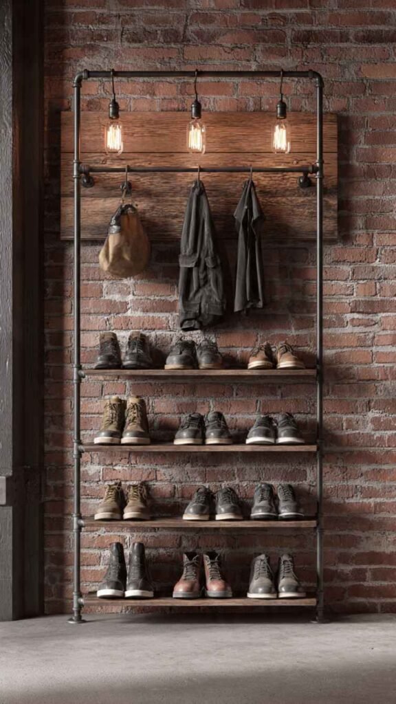 Black iron pipe combined with reclaimed wood creates a shoe rack that looks genuinely expensive and custom-made, the kind of thing you would see in a high-end loft apartment or a boutique store. The pipes act as both the frame and the horizontal rods that hold the shoes, with the wood serving as the backing panel or top shelf. The whole thing has that warm industrial quality where the rough character of the reclaimed wood balances the sleekness of the black metal. It works in industrial, modern farmhouse, and contemporary spaces and it’s sturdy enough to hold a lot of heavy boots.