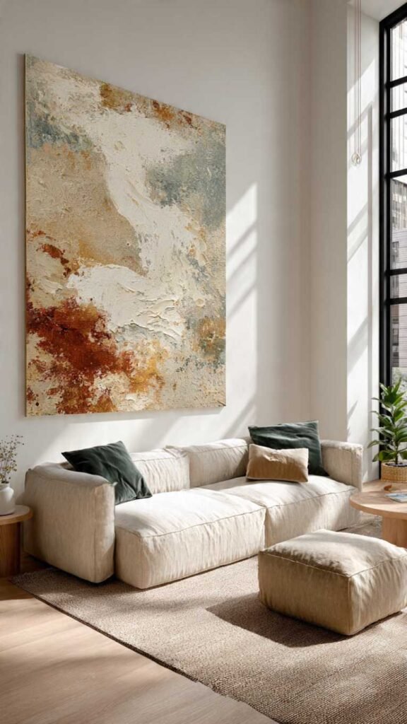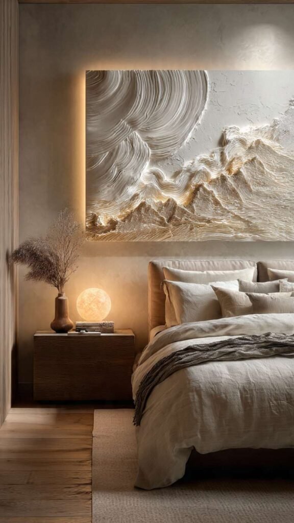 This technique produces some of the most beautiful and sophisticated looking wall art on this entire list and uses a material most people have never thought to use for art – joint compound, also called drywall mud, from the hardware store. You spread it onto a canvas with a palette knife or old credit card, creating peaks, ridges, swirls, and texture, let it dry, and then paint over it in neutrals. The texture catches light and creates shadows that make the piece look like expensive sculptural art. These pieces look incredible in bedrooms, living rooms, and home offices.