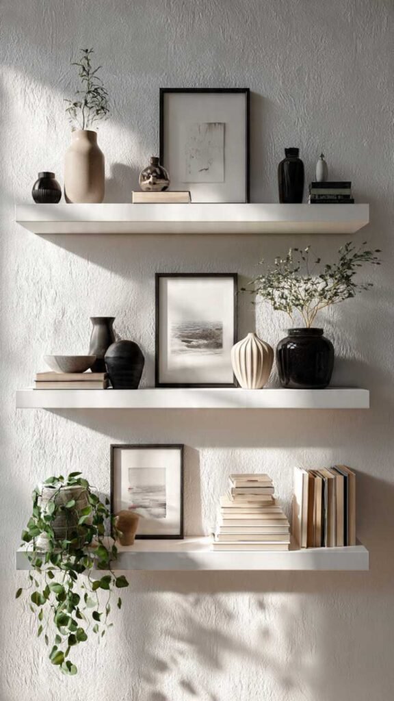Quick How-To: Install floating shelves at varied heights using a level. Style with a mix of heights – tall items at back, shorter in front. Vary textures: smooth ceramics, rough natural objects, glossy books. Add one trailing plant per shelf. Leave some empty space so it doesn’t look cluttered.
