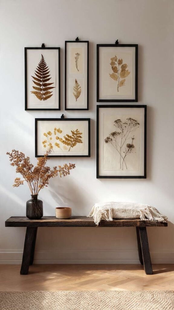 DIY Tip: Change your botanicals with the seasons to keep the wall art feeling fresh – spring flowers in spring, colorful autumn leaves in fall, evergreen sprigs in winter. The frames stay the same and you just swap out the specimens, which costs nothing if you collect them yourself.