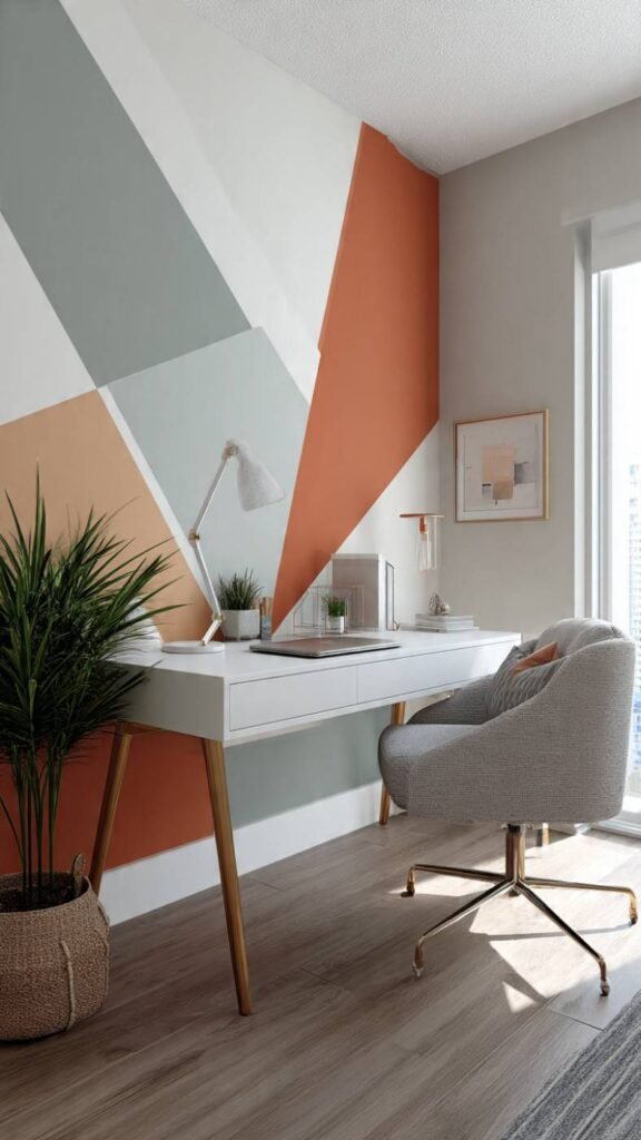 Quick How-To: Plan your geometric pattern and lightly mark guidelines with pencil and level. Apply painter’s tape along all lines pressing firmly. Paint each section in your chosen colors. Let dry. Apply a second coat. Peel tape slowly at a 45-degree angle while paint is still slightly tacky for sharpest edges.