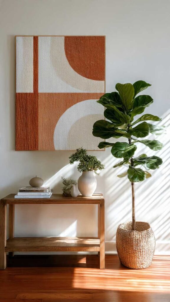 Sometimes the best wall art isn’t a single hanging piece but a thoughtfully styled arrangement on floating shelves that creates a visual moment on your wall. A set of two or three simple floating shelves styled with a mix of objects – a small framed print, a sculptural vase, a trailing plant, a stack of books, a candle – creates a layered three-dimensional wall display that is more interesting and alive than anything flat could be. The key is treating the whole shelf arrangement as a composition the same way you would a painting, thinking about height, texture, color, and negative space.
