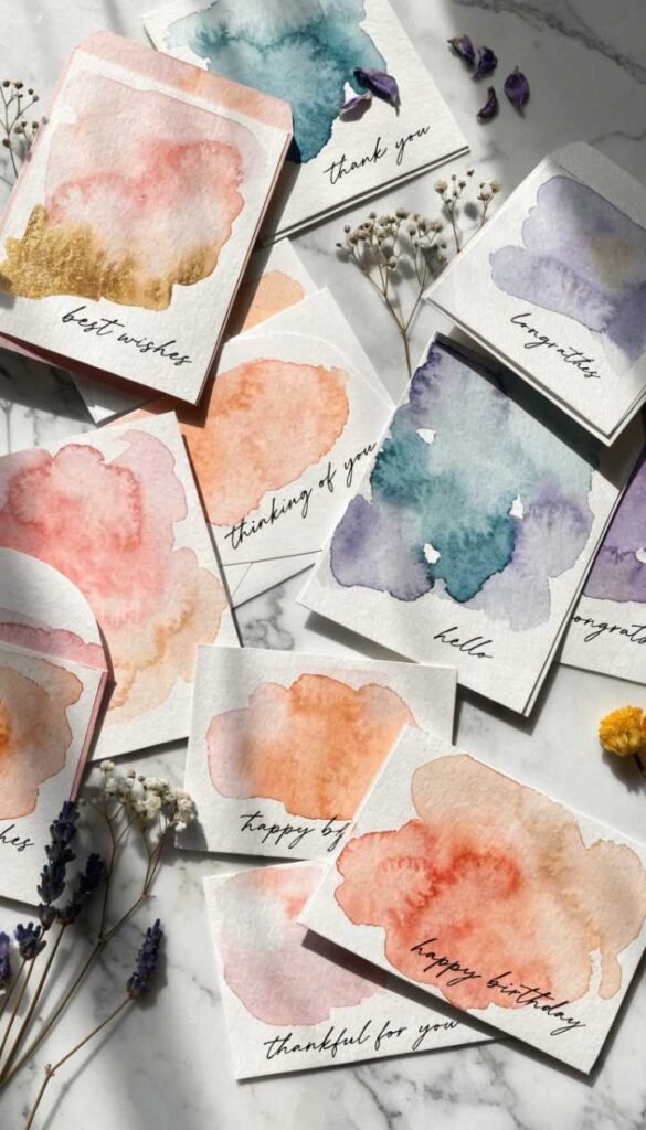 This is the most beginner-friendly watercolor technique there is and honestly the results look so professional that people will think you actually know what you’re doing. You wet the card paper first, then drop in two or three colors and let them spread and blend on their own. You barely touch it – the water does all the work. Once it dries you have this gorgeous soft gradient background that you can add a simple message to with a pen or stamp. These work as birthday cards, thank you cards, just because cards – literally any occasion.