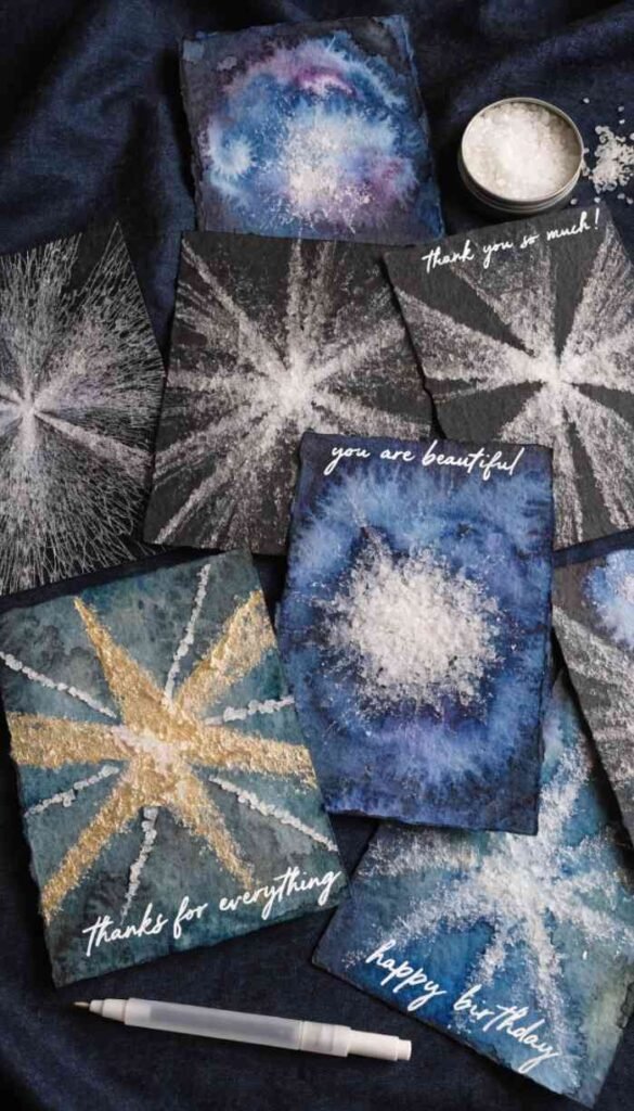 This one involves a little kitchen science and it feels like a magic trick every single time. You paint a watercolor wash onto wet paper, and then while it’s still wet you sprinkle table salt over the surface. The salt absorbs moisture in little bursts as it dissolves and leaves behind the most beautiful starburst and snowflake patterns. Every card comes out completely unique and the texture looks like something between a galaxy and a snowstorm. These make incredible winter holiday cards or birthday cards – honestly they just look like you bought them from an expensive stationery shop.