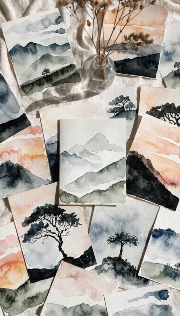 What It Is: Simple minimalist watercolor landscape cards featuring loose painted scenes – mountains, sunsets, fields, and tree silhouettes in soft layered washes.