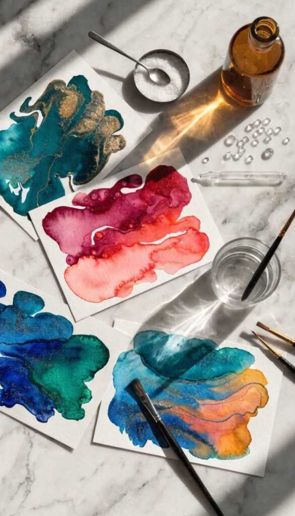 Supplies and Budget: Watercolor paper cards ($8–12), watercolor paints ($8–15), table salt (already in your kitchen), brushes, white gel pen ($3–4). Total: $19–$31