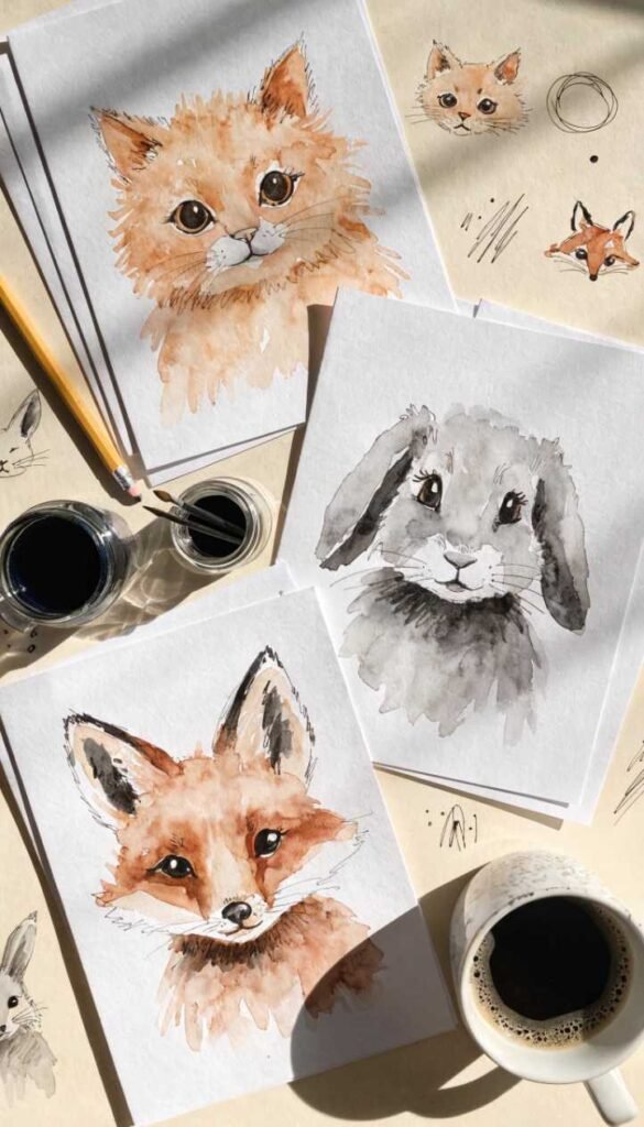 Loose watercolor animal faces are incredibly charming and much easier than you’d think because you’re painting them in a simple, rounded, almost cartoonish style rather than trying for realistic portraits. A round head, simple ears, dot eyes, a little nose – that’s basically your cat or dog or rabbit face. Add soft washes of the right colors and a simple background wash and it reads immediately as the animal you intended. These are incredibly sweet as birthday cards for pet lovers or as thank you cards. Kids go absolutely wild for them and adults secretly do too.