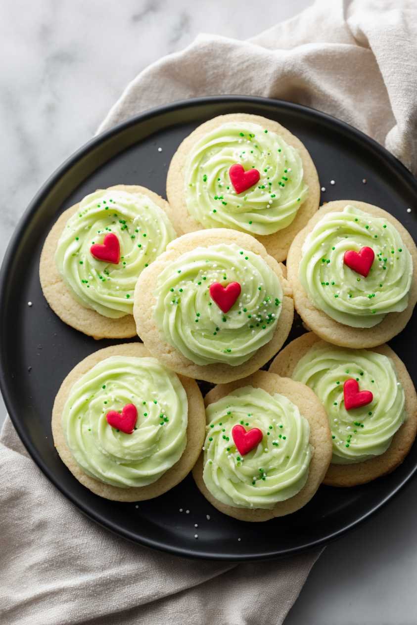 Step 5: Spread or pipe the frosting on each cooled cookie. While the frosting is still soft, place a red heart sprinkle in the center to represent the Grinch’s heart. Add green sprinkles around the edges if desired. Let the frosting set for about thirty minutes. These Grinch frosted cookies are beautiful and bakery-quality with smooth frosting. The decorated tops make them impressive. They’re perfect for special occasions or gifting.