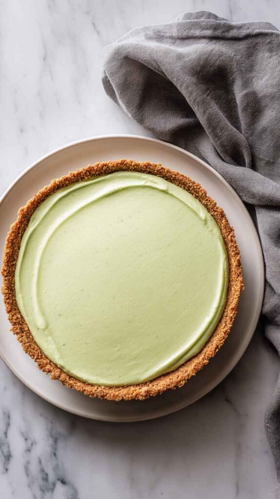 Step 3: Pour the filling into the cooled crust, spreading it evenly so it settles into a smooth surface. The soft pale green color feels refreshing, almost soothing, and you can already sense how light and bright the final pie will taste.