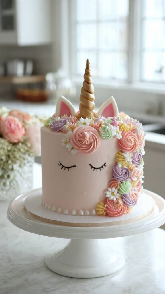 This is the unicorn cake that started the whole trend – soft pastel buttercream with a gorgeous rainbow mane. The cake is usually covered in pale pink, lavender, or mint green buttercream, smooth and simple. Then you create the unicorn face on top with a gold fondant horn, white fondant ears with pink insides, closed eyes with long lashes made from fondant or piped in black buttercream. The mane is the star – piped buttercream swirls in rainbow colors flowing down the side of the cake. Add some fresh flowers tucked into the mane, maybe some pearls or stars. It’s sweet, it’s pretty, and it’s absolutely perfect for young girls who love everything magical and colorful.