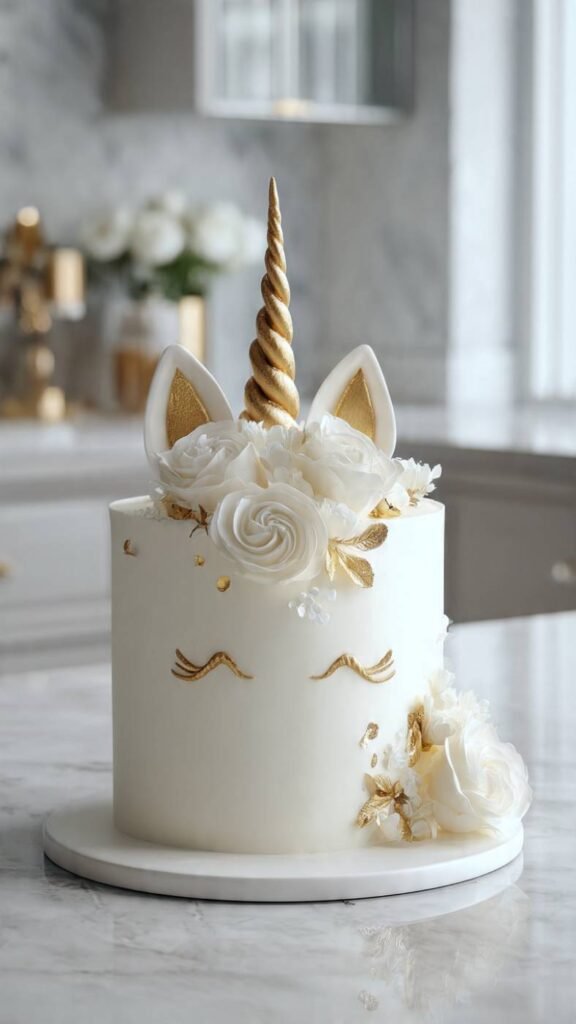 For a more sophisticated take on the unicorn cake, go minimalist with just white and gold. Cover the cake in smooth white buttercream or fondant, then add a tall elegant gold horn – either fondant painted with gold luster or actual gold leaf. The ears are white with just a touch of gold on the edges. Eyes are simple and elegant, either closed or just gentle. Instead of a full colorful mane, just add a few gold buttercream swirls or skip the mane entirely. Maybe add one or two white roses and some gold leaf accents. It’s refined, elegant, and proves unicorn cakes don’t have to be super colorful to be magical.