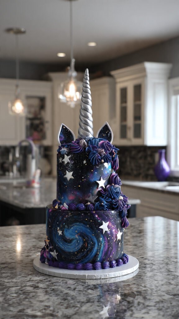 For something more dramatic and modern, create a galaxy-themed unicorn cake. The base is decorated with deep purples, blues, and blacks swirled together like outer space, with edible glitter or luster dust creating stars and sparkle throughout. The unicorn horn is tall and metallic – silver or holographic – and the ears can be in coordinating galaxy colors. Add some star decorations, maybe some planets made from cake pops or fondant. The mane could be in galaxy colors too – deep purples and blues with silver accents. It’s perfect for older kids or teens who want something magical but a bit edgier and more grown-up than traditional pastels.