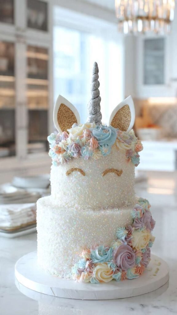 For the birthday girl or boy who wants maximum sparkle, create a unicorn cake that’s all about the glitter and shine. Use edible glitter dust in the buttercream to make the whole cake shimmer – you can do all white with glitter, or pastel colors with coordinating glitter. The horn should be covered in edible glitter or made from isomalt to really sparkle. Add edible glitter to the mane, sprinkle it around the base, use glittery fondant for the ears. Add some disco dust, luster dust, anything that catches the light. It’s glamorous and sparkly, perfect for kids who want their cake to literally shine and be as magical as possible.