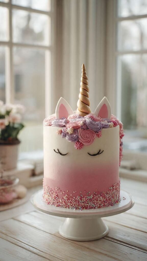 This cake is all about pretty pink perfection. Create an ombre effect with the buttercream frosting going from deep pink at the bottom gradually to pale pink and then white at the top. The gradient should be smooth and beautiful. Add the unicorn face on top with a white or gold horn, pink and white ears, sweet closed eyes. The mane can be in coordinating pink shades or add some purple and lavender for variety. Press pink and white sprinkles around the base of the cake or create a sprinkle waterfall on one side. It’s feminine, pretty, and perfect for princess-themed parties or anyone who loves all things pink.