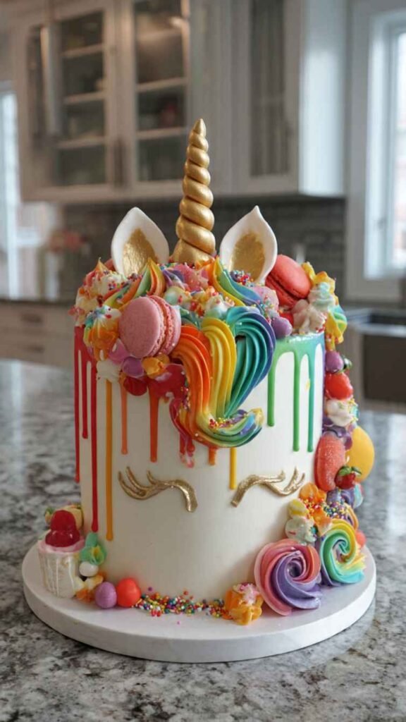 Combining two of the most popular cake trends – unicorns and drip cakes – creates something absolutely show-stopping. Start with white or pastel buttercream, then add rainbow-colored drips cascading down the sides in red, orange, yellow, green, blue, and purple. Top with a gold unicorn horn, ears, closed eyes with lashes, and a rainbow buttercream mane. Load up the top with rainbow sprinkles, meringues, macarons, candies, and treats in rainbow colors. It’s over-the-top in the best way, perfect for a big celebration where you want maximum impact. Kids go absolutely crazy for these because they’re so colorful and covered in candy.