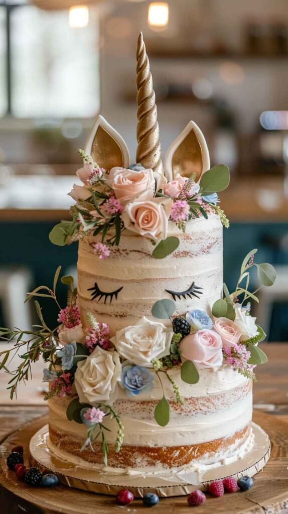 For a more natural, bohemian take on the unicorn cake, use the naked or semi-naked cake style where you can see the cake layers with minimal frosting. The exposed layers give it a rustic, homemade feel. Decorate the top with a simple unicorn face using natural-colored horn (maybe cream or ivory instead of bright gold), ears in natural tones, gentle closed eyes. Add fresh flowers in soft natural colors, eucalyptus, and maybe some berries. The mane can be minimal or done in natural buttercream tones. It’s perfect for outdoor parties, bohemian themes, or when you want unicorn magic with a more earthy, natural aesthetic.