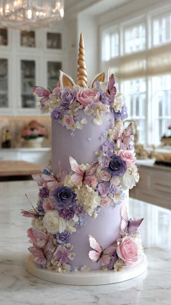 This design brings a garden party feel to the unicorn cake with lots of edible flowers and butterfly decorations. Cover the cake in soft buttercream – maybe lavender, mint, or cream – then decorate with edible flowers like pansies, violas, or rose petals. Add fondant or wafer paper butterflies in coordinating colors scattered around the tiers and in the mane area. The unicorn horn can be white or pastel with flowers wrapped around the base. The whole effect is nature-meets-magic, perfect for outdoor parties, spring birthdays, or anyone who loves gardens and butterflies along with their unicorns.