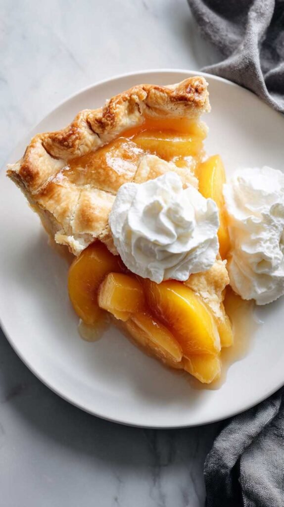 Some pies are comforting on their own, but when you add a cloud of whipped cream, something magical happens. This peach pie feels like a dessert you serve on warm evenings when you want something sweet but delicate. The whipped cream adds a cool softness that melts into the warm peaches, creating a spoonful that tastes light, creamy, and nostalgic all at once. It’s the kind of pie that brings people to silence for a moment because they’re savoring the texture and sweetness.