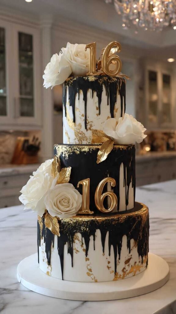 For a bold, dramatic sweet sixteen, go with a sophisticated black, white, and gold color scheme. This could be black and white striped tiers with gold accents, or smooth black fondant with gold and white details. Add gold drips, white flowers, gold leaf, and that number sixteen prominently in gold. It’s very fashion-forward and glamorous, like something from a high-end party or magazine shoot. Perfect for a girl with strong personal style who isn’t afraid to make bold choices. This cake works beautifully for formal evening parties or anyone who wants something that feels grown-up, elegant, and a little bit edgy.