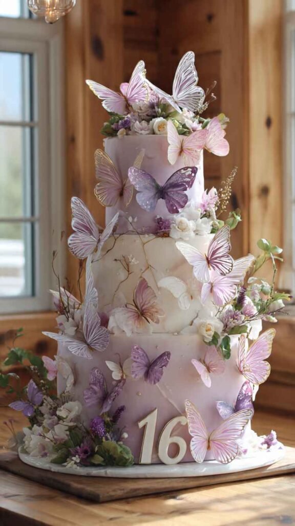 Butterflies represent transformation and growth, making them perfect for a sweet sixteen theme. Create a cake decorated with beautiful butterflies in various sizes – you can use wafer paper butterflies, fondant butterflies, or even edible printed ones. Arrange them like they’re flying around the cake, some on the tiers and some on wires so they appear to be hovering. Add fresh flowers and greenery to create a garden feel. Keep the base cake in soft colors like white, pale pink, or lavender. Include a pretty “16” somewhere among the butterflies and flowers. It’s whimsical and beautiful, perfect for an outdoor party or garden theme.