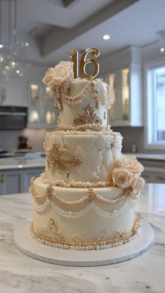 For a more sophisticated, grown-up sweet sixteen, create a cake that feels luxurious and elegant with champagne colors and pearl details. Cover the tiers in champagne or ivory buttercream, then add hundreds of small royal icing pearls creating borders, patterns, or covering entire sections. You can add some gold accents, maybe a fondant champagne bottle or glass as decoration since sixteen feels grown-up. Include some cream roses or white orchids. The number sixteen should be elegant, maybe in gold or crystal-looking fondant. It’s classy and refined, perfect for a formal sweet sixteen celebration or a girl with sophisticated taste who wants to feel elegant and special.