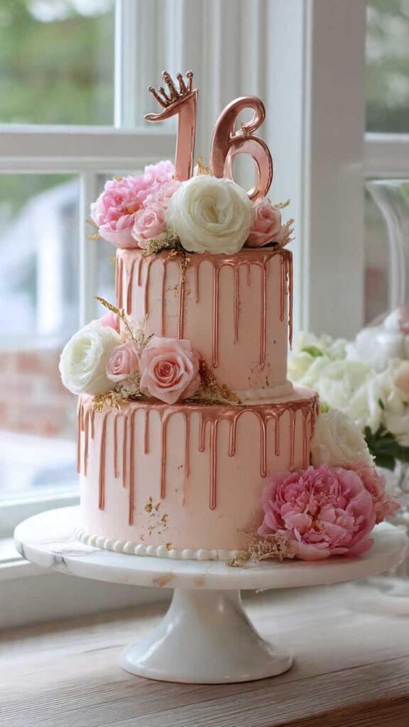 Rose gold is still incredibly popular with this age group, and when you pair it with soft blush pink, it’s absolutely stunning. This cake has smooth blush pink buttercream on the tiers with rose gold accents everywhere – metallic drips cascading down the sides, rose gold fondant details, edible rose gold leaf scattered artistically. Add fresh roses and peonies in coordinating shades of pink and cream. The number sixteen can be in rose gold on top, maybe with a small crown or tiara detail. It’s sophisticated and feminine without being too young or childish. Perfect for a girl who loves elegance, pretty things, and that glamorous aesthetic. This cake photographs beautifully and feels really special.