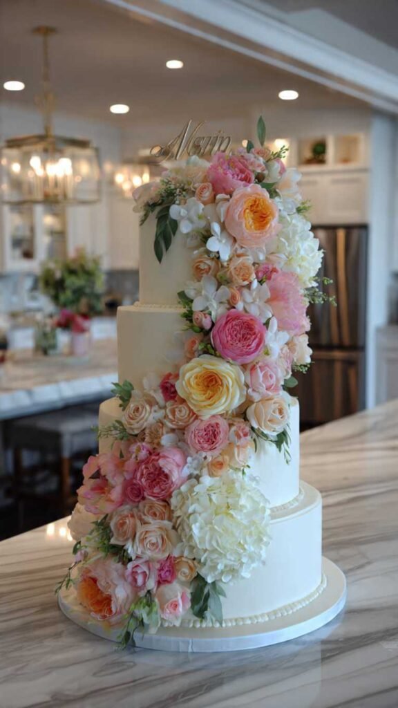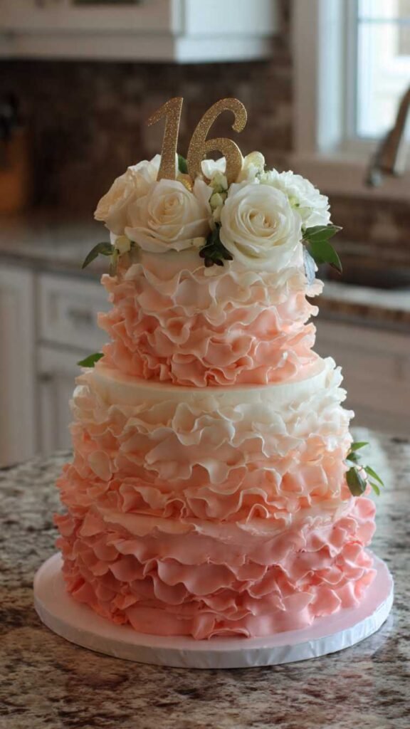 This design is for the girl who loves flowers and romantic, garden-inspired things. Create a beautiful cascade of fresh or sugar flowers flowing down from the top tier to the bottom, like a floral waterfall. Use roses, peonies, ranunculus, hydrangeas, whatever flowers she loves, in her favorite colors. The cake itself can be covered in smooth white or ivory buttercream so the flowers really pop. Add some greenery like eucalyptus or ferns mixed in with the flowers. Place a delicate “Sweet Sixteen” or just “16” topper at the top. It’s breathtaking and romantic, perfect for spring or summer birthdays, garden party themes, or anyone who appreciates natural beauty and elegance.